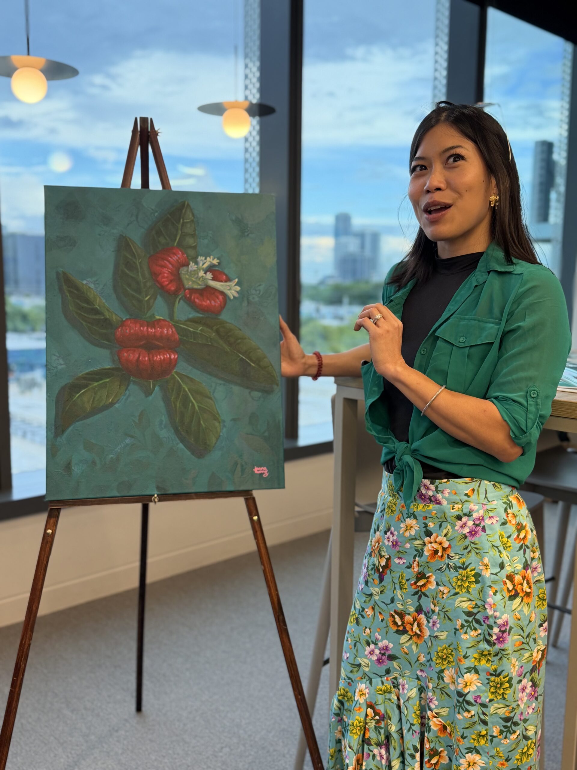The painting honors anyone who has navigated adversity, just like the lotus transforms its environment into a home for itself and others.